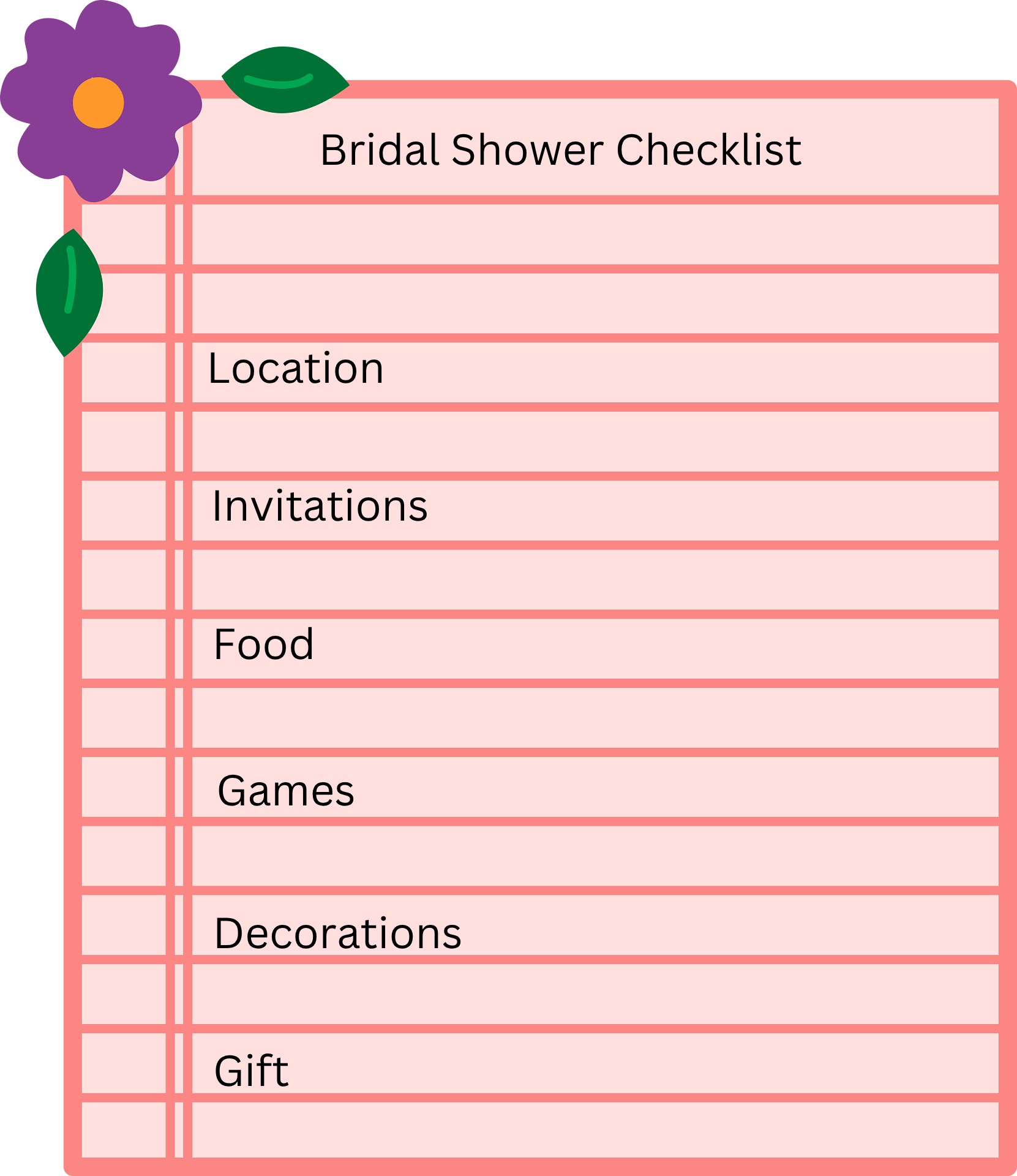 A bridal shower checklist is a list of tasks that need to be completed on, or just before, the day of the event. This will help keep you on track and organized. It can also be very helpful in eliminating any last minute unnecessary stress.